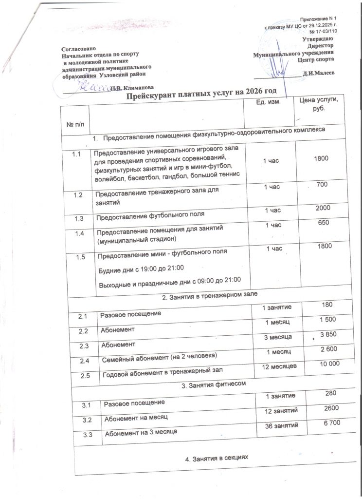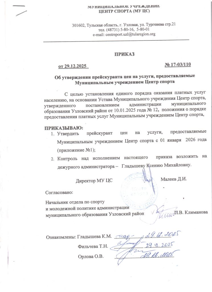 Приказ об утверждении прейскуранта цен на услуги, предоставляемые МУ ЦС от 29.12.2025